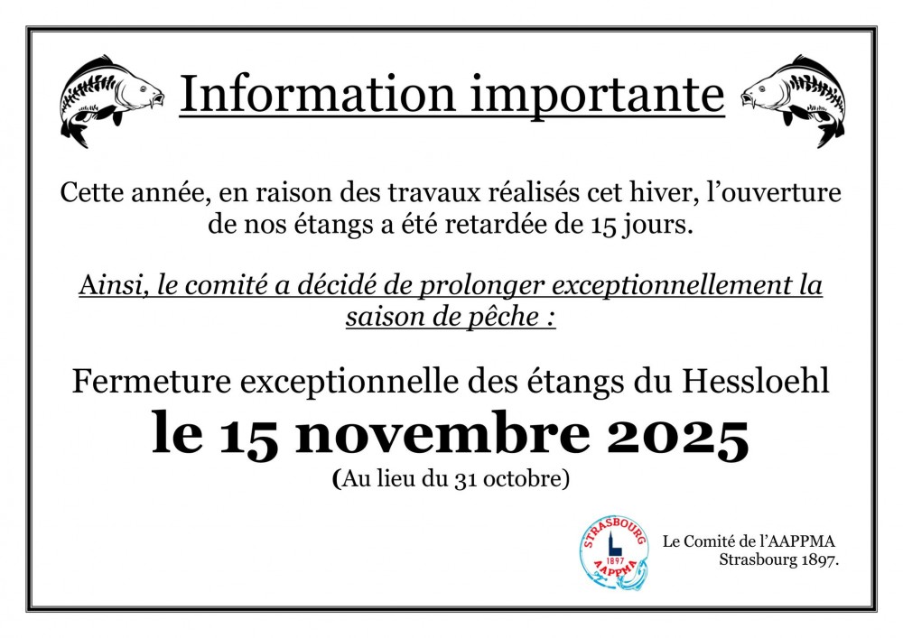 De plus, notre association dispose avec les étangs Hessloehl, adossés à notre chälet, chemin du grand Belzwoerth à la Robertsau, un très beau site de pêche reposant et bucolique qui est praticable du 1er mai au 30 octobre pour tous ceux qui aiment cette ambiance des eaux dormantes pour taquiner la carpe, la tanche et les poissons blancs.